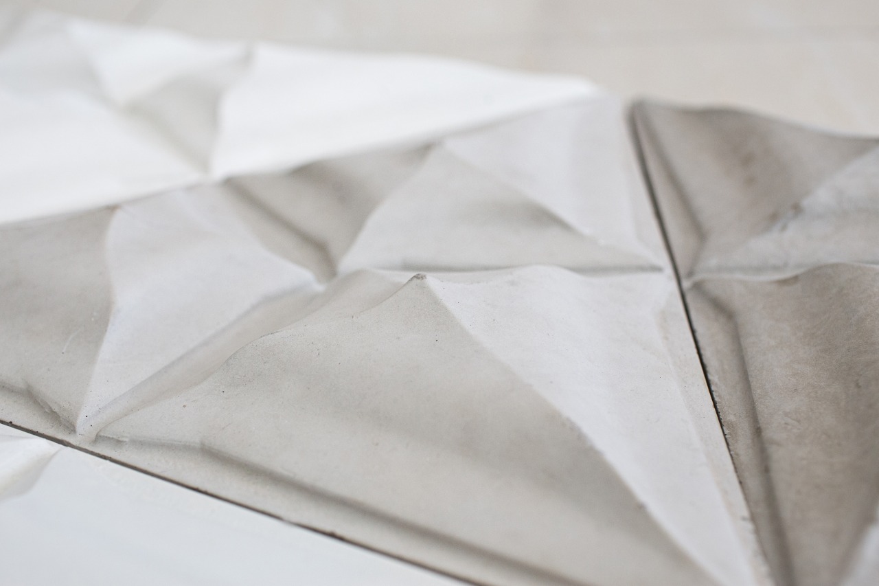 Produzida em cimento com acabamento artesanal, a peça une sofisticação e resistência, podendo ser aplicada em ambientes internos ou externos. Seu relevo delicado valoriza a tridimensionalidade e oferece infinitas possibilidades de paginação.