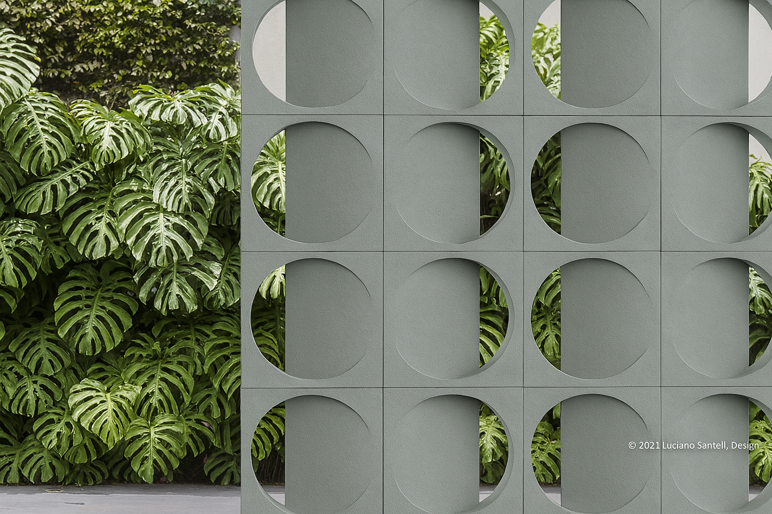 O cobogó Moon, assinado por Luciano Santelli, é uma ode à geometria essencial. Um círculo esculpido com precisão dentro do concreto, como uma lua cheia de mistério e magnetismo.
